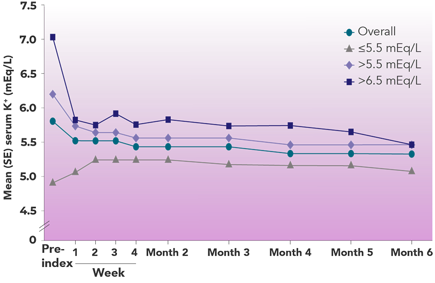 Within the subgroups, serum K+ decreased most among those with higher pre-index serum K+ (>6.5 mEq/L subgroup decreased by 1.3 mEq/L by Week 1)8†
