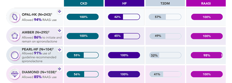 Proven efficacy with concomitant RAASi use backed by 4 placebo-controlled trials across co-morbidities2–5