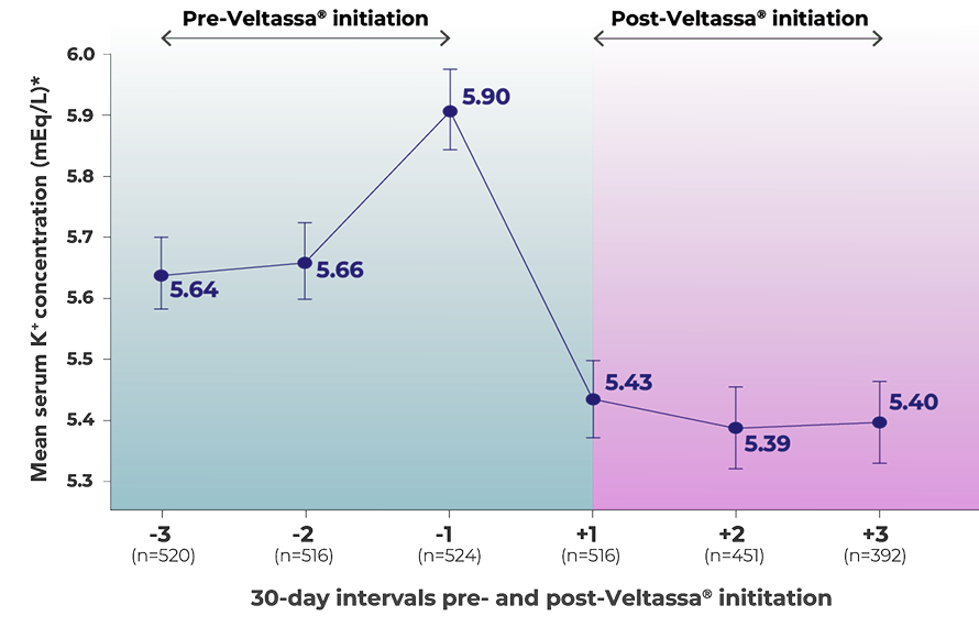 Statistically significant reductions in K+, averaging approximately –0.5 mEq/L, were observed post-Veltassa® initiation (48% pre-Veltassa® vs 22% post-Veltassa® had K+ ≥6.0 mEq/L) (p<0.001)8