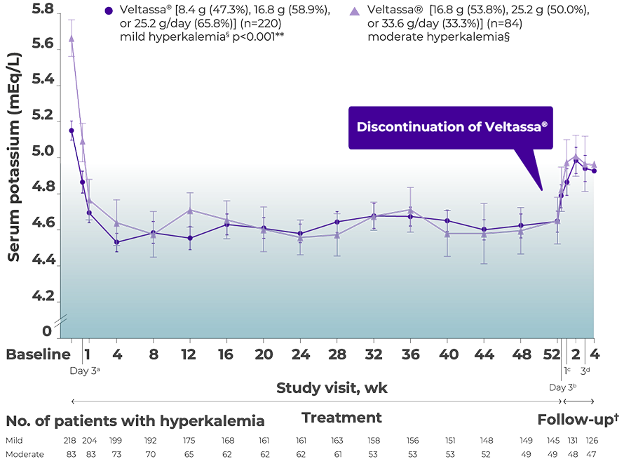 **At all points, p<0.001 (2-sided t-test) for least squares mean changes from baseline and Week 52 (or from last dose of patiromer received during the study).4