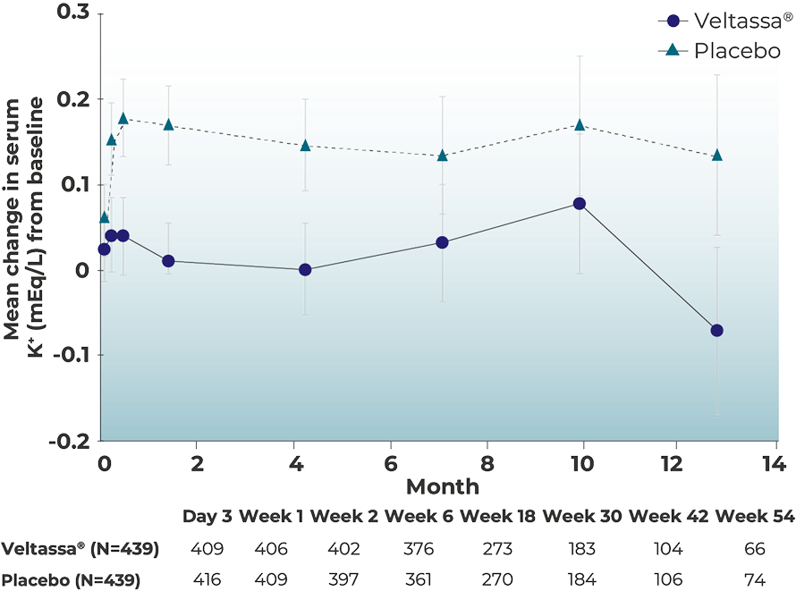 Patients on Veltassa® observed a between group-difference of –0.10 mEq/L vs placebo, in adjusted mean change in serum K+ levels (primary endpoint)